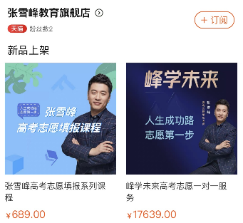 多知网发现,近期研途教育在天猫开出名为“张雪峰教育旗舰店”的新店铺。上线的两款产品与高考志愿填报相关,包括689元的系列课程,17639元的高考志愿1对1服务。