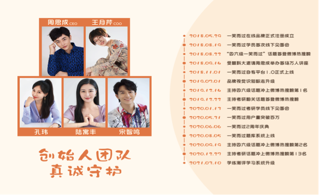 一笑而过成立于2018年,由前新东方名师周思成、陆寓丰、孔玮、宋智鸣和原新东方在线高管王月芹五人一起创办。