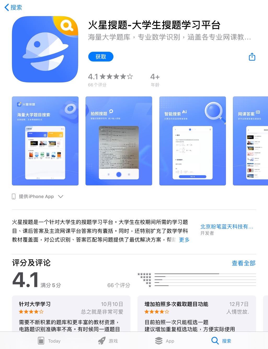 据苹果应用商店开发者信息介绍,火星搜题App是一个针对大学生的搜题学习平台,正式于今年2月在应用商店上线。