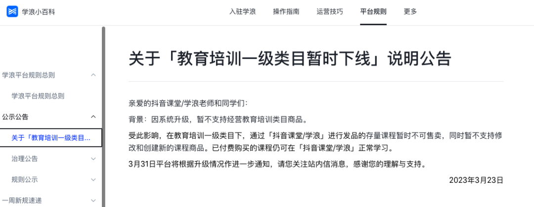 多知网3月24日消息,日前,学浪面向抖音课堂/学浪的用户发送《关于「教育培训一级类目暂时下线」说明公告》通知。学浪方面称,因系统升级,暂不支持经营教育培训类目商品。