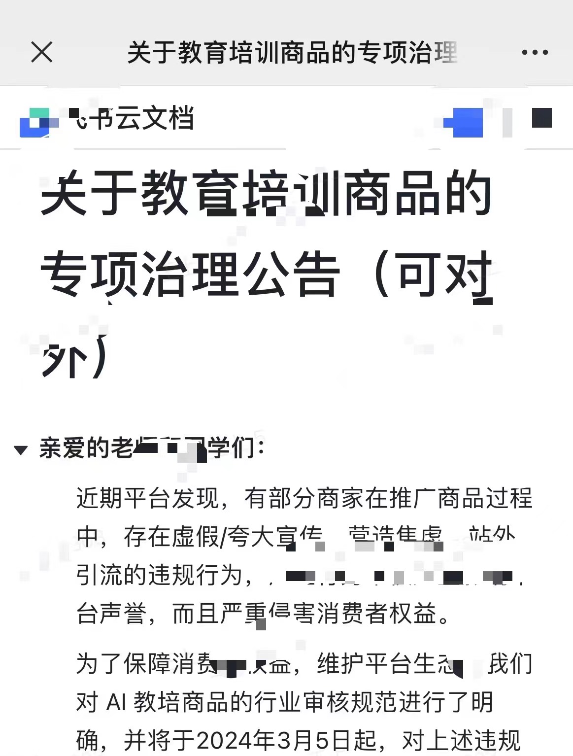 为了保障消费者权益,维护平台生态,学浪对AI教培商品的行业审核规范进行了明确,并将于2024年3月5日起,对上述违规行为实行专项治理,展开全面的信息排查和清理工作。