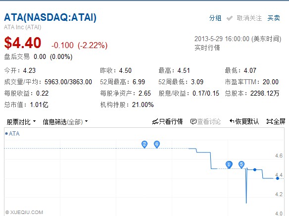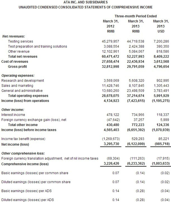 ATA今日凌晨公布了截止2013年3月31日的2013财年四季度财报,当季营收840万美元,同比降1.2%。净亏损99万美元,去年同期净利润330万美元。以下为2013财年四季度业绩摘要: