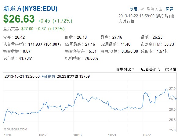 截止2013年8月31日,新东方持有的现金和现金等价物总值4.806亿美元,上季度为4.172亿美元。