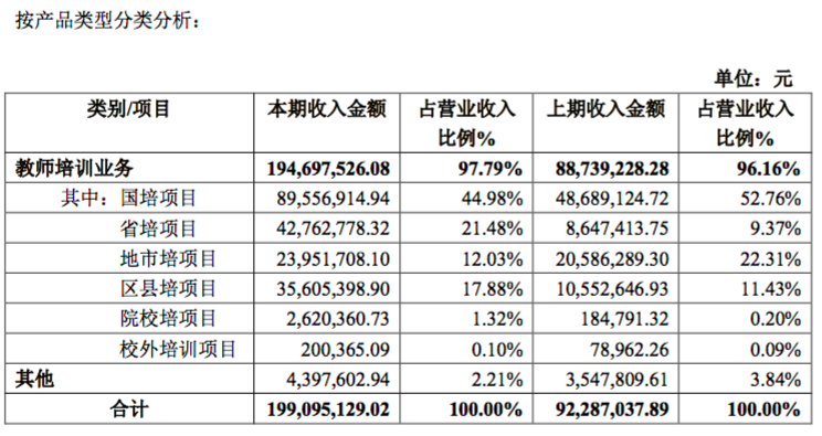 营收增长全部来自于教师培训业务,增长原因是因为:成功拓展山西、云南、西藏新区域市场;已进入区域的客户需求挖掘取得成效,其中浙江、海南、青海等省份订单额增长迅猛。