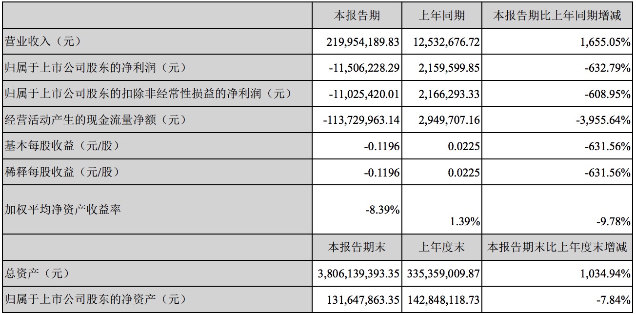如表所示,经营活动产生的现金流量净额-1.14亿元,同比下降3955.64%;基本每股收益-0.12元/股,同比下降631.56%。