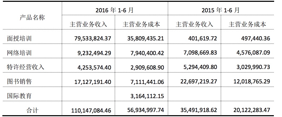 在产品方面,文都教育主营业务包括面授培训、网络培训、图书销售、国际教育等。其中,面授教育收入和成本分别是7953.38万元、3580.94万元,相比上期分别增长了7913.22万元、3531.2万元;图书销售收入和成本分别为1712.72万元、711.14万元,同比上期分别下降了557万元、490.73万元;国际教育成本316.41万元。
