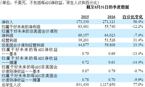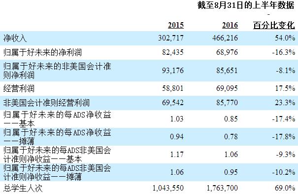 多知网10月27日消息,好未来今日发布截至2016年8月31日未经审计的2017财年Q2财报。财报显示,好未来2017财年Q2总营收2.71亿美元,同比增长56.4%,净利润5574万美元,同比下降12.2%;2017财年上半年总营收4.66亿美元,同比增长54.0%;净利润6898万美元,同比下降16.3%。