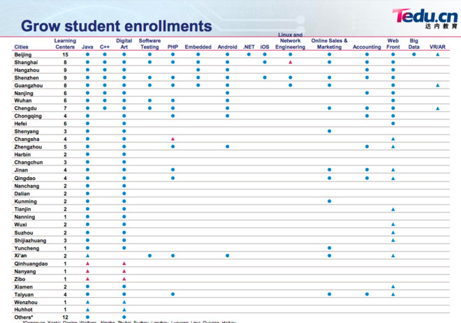 产品线的扩张,从IPO时候的11门课程增加到18门课程,尤其是IT产品线的拓张非常成功,web前端、大数据、VR/AR课程都紧跟市场需求;非IT类课程,UI是达内这些年最成功的一个产品线,2013年推出以后到现在已经成为招生最多的课程,但UI仍然是和IT行业高度相关的职业,达内上市后一直想在IT以外找到新的增长点,2014年推出的会计课程,曾经被寄予厚望,并且在2015年扩张到了十几个城市,公司在财报里也多次提及,但是2016年没有新增一个教学点,而且公司也怎么不在财报里提会计业务了,不知道这块业务是不是遇到什么瓶颈?有待核实。