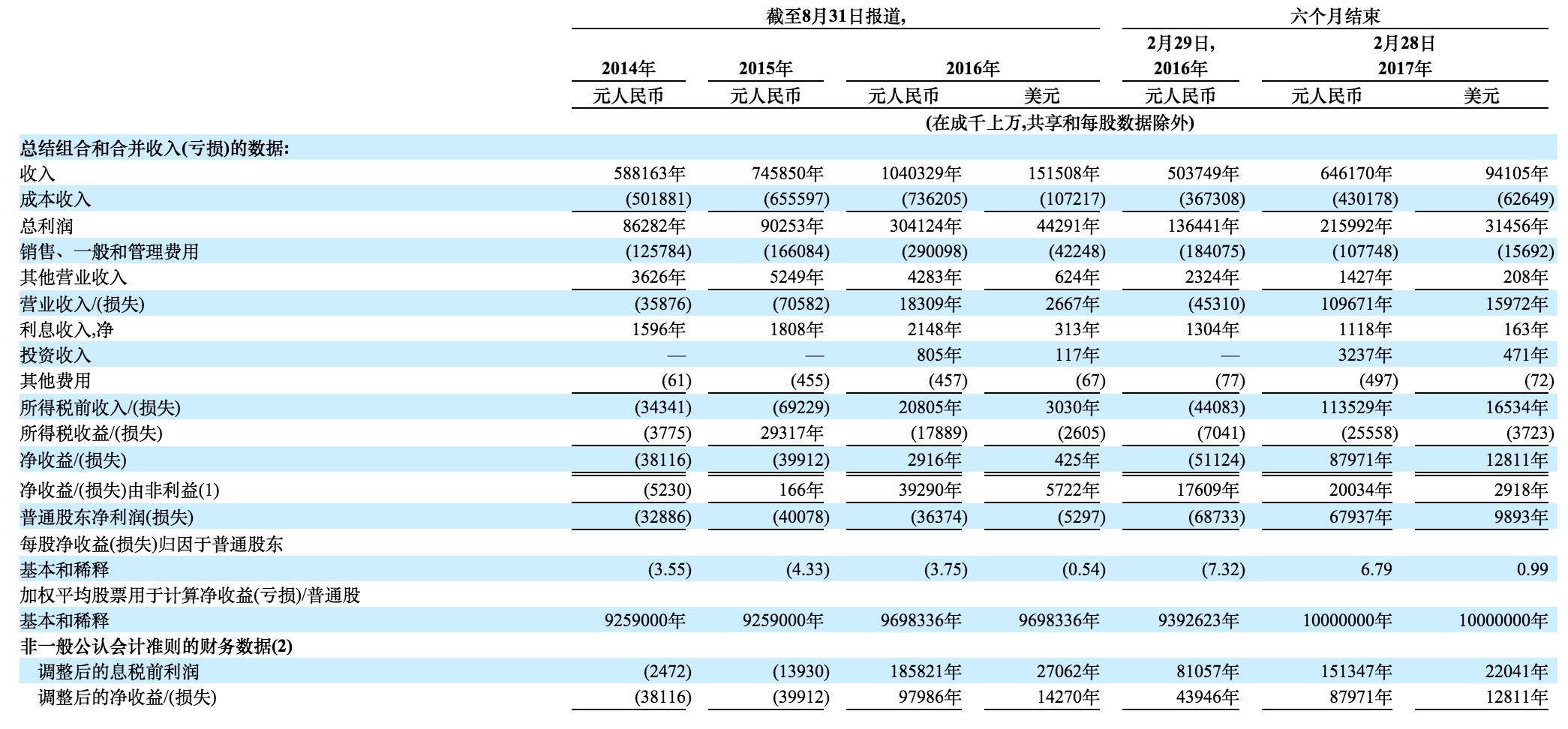 招股书披露了2014、2015、2016财年及截至2017年2月28日的半年财务数据。