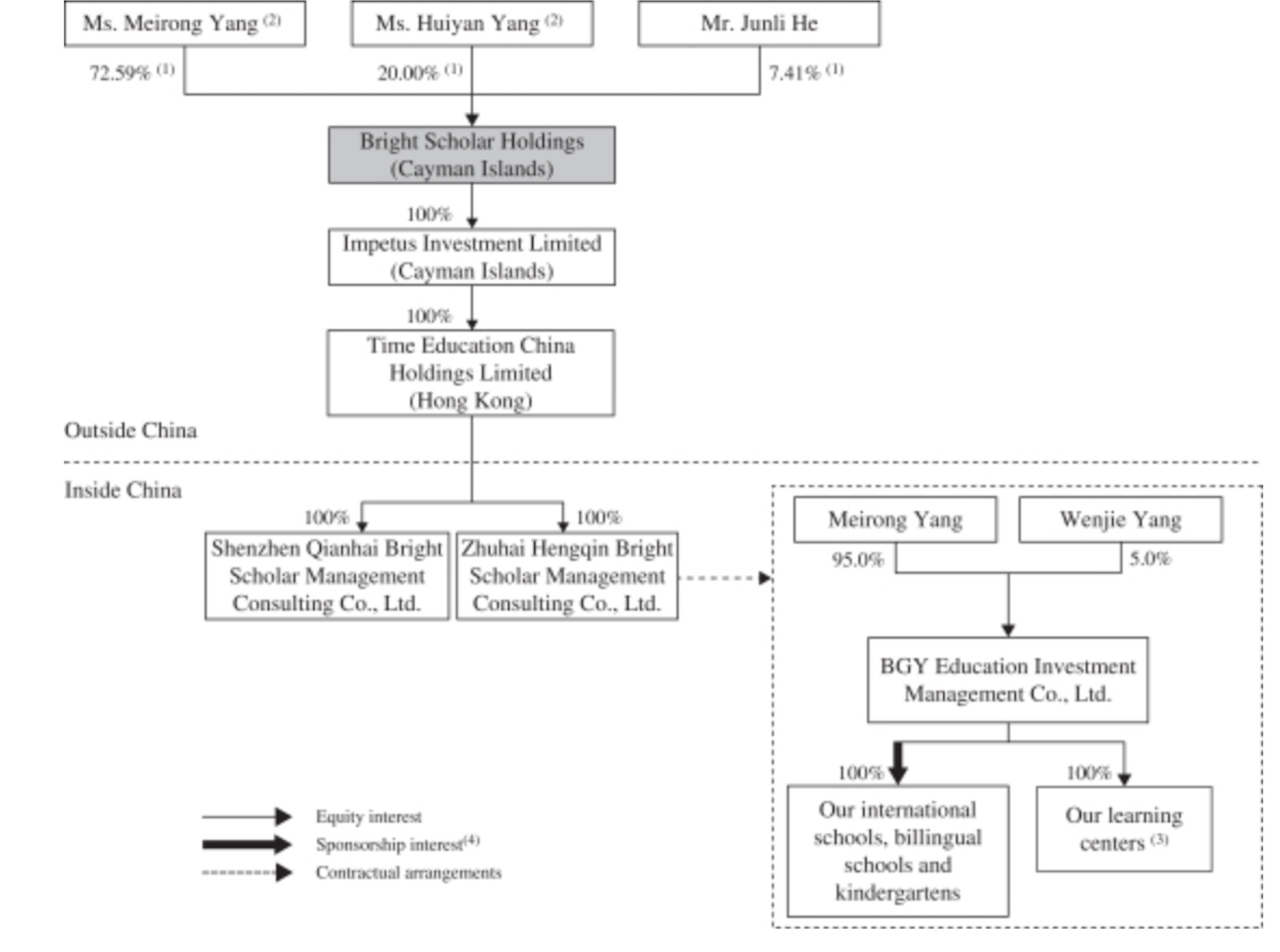 招股书披露,由于中国对教育服务的外国所有权的法律限制以及提供义务教育的学校分配给其出资人的能力,博实乐通过BGY(碧桂园)教育投资公司进行业务,该基金由中国公民持有。2010年1月,碧桂园博实乐教育控股有限公司与BGY(碧桂园)教育投资有限公司的股东杨美荣,杨文洁先生签订了一系列合同安排,合同安排于2017年1月25日执行并生效。博实乐教育所有的资产和业务均由本集团所有,其收入贡献占2014年,2015年和2016财政年度总收入的100%。