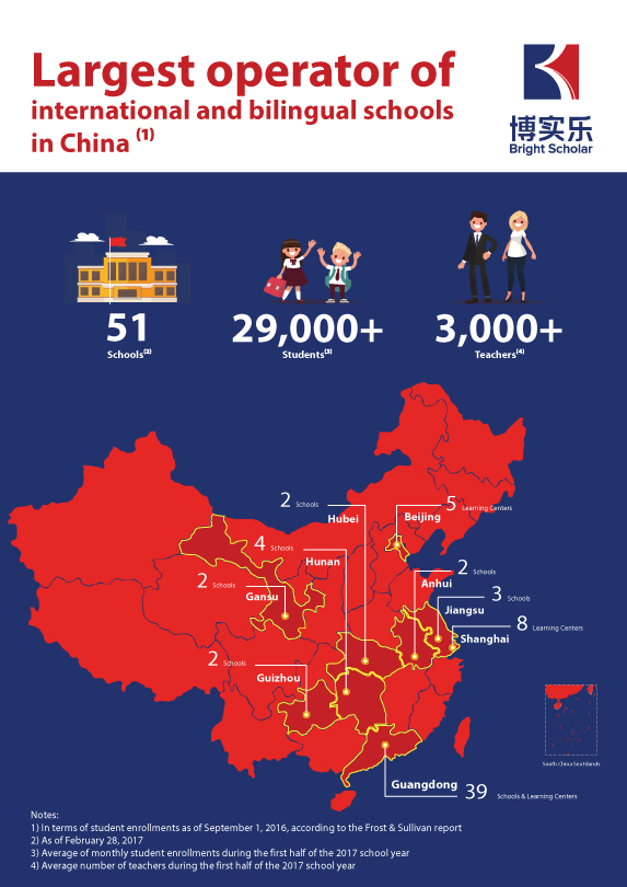 截至2017年2月28日,博实乐教育共有6所国际学校、11所双语学校和34所幼儿园。