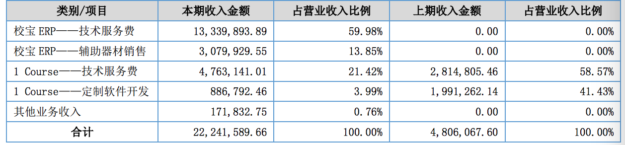 报告称,校宝在线是通过先人工智能(AI)、自然语言处理(NLP)、深度学习(DL)以及数据挖掘(DM)等技术,为各类教育培训机构提供内部管理、对外招生、家校通、教学测评练等提供解决方案。目前,校宝在线有新媒体营销工具(校宝秀)、教务管理系统(校宝ERP)、学习管理系统(1Course)三大业务模块,校宝在线的主要收入来源为于授权客户使用1Course和校宝ERP的技术服务费,根据客户订购服务的数量和时间长短获取收入、利润及现金流。