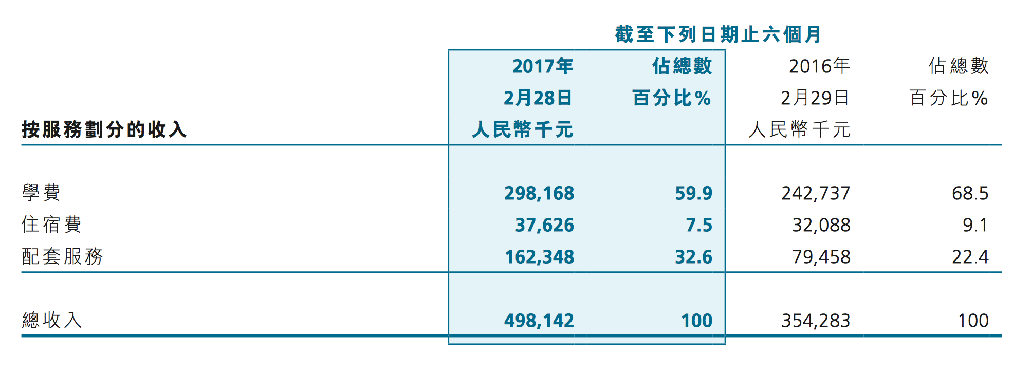 报告披露,收入来自向学生收取的学费、住宿费、配套服务费及其他支援服务。报告期内,学费收入为2.98亿元,占比59.9%。学费及住宿费增加,主要由于整体招生人数增加及若干学校提高了学费及住宿费的费率,从2015-2016学年起,新入学的学生将按增加的费率缴纳学费及住宿费。