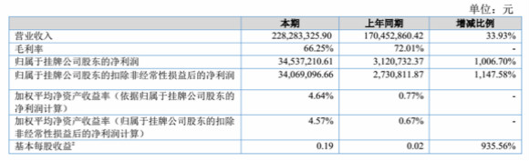 归属于挂牌公司股东的净利润3453.72万元,同比增长1006.70%。