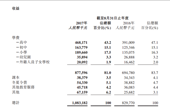 枫叶教育营收主要来自学费、向学生销售及租出课本及其他教材、冬夏令营的收入、其他教育收入以及包括自营超市、提供校服等服务在内的其他收入。根据报告,学费收入为87759.6万元,占全部收入比例为81.02%,其他收入为20558.6万元。2016-2017学年,枫叶教育每名学生平均学费为3.86万元,高中所收取的学费为人民币4.9-10万元。