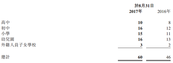 截至报告期末,枫叶教育拥有60所学校,分别位于中国及加拿大的16个城市,新增学校14所。按类型划分情况如下: