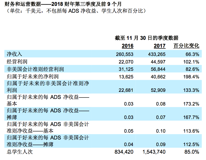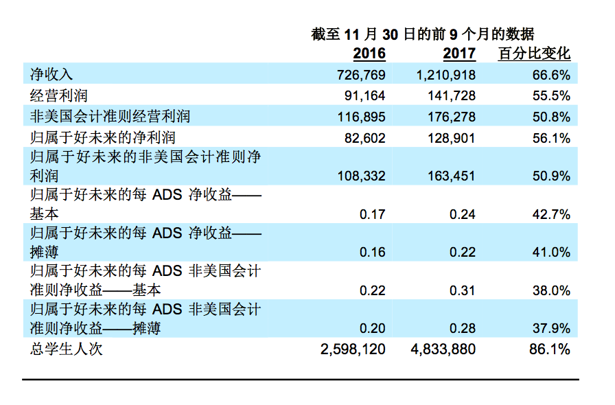 多知网1月25日消息,好未来发布截至2017年11月30日的2018财年第三季度未经审计财务报告。报告期内,第三季度净收入4.333亿美元,增幅为66.3%;净利润是4066.2万美元,同比增长198.4%。截至2017年11月30日的前9个月营收12.109亿美元,增幅为66.6%;净利润1.289亿美元,增幅为56.1%。