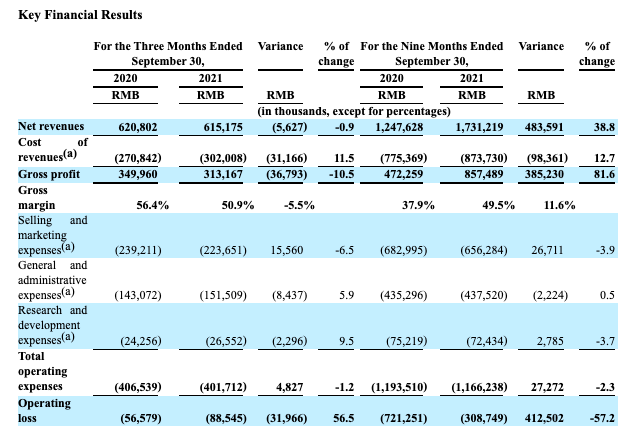 销售和营销费用从2020年同期的2.392亿元降至2.337亿元,降幅6.5%。这主要是因为,与2020年同期相比,2021年第三季度的广告费用有所减少。