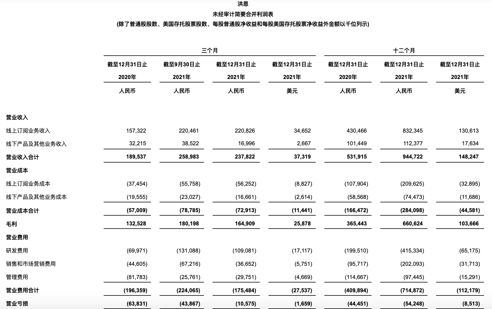 2021全年洪恩营收9.447亿元,同比增长77.6%;全年净亏损为3,710 万元(580万美元),去年净亏损为3,750万元,同比略有收窄。