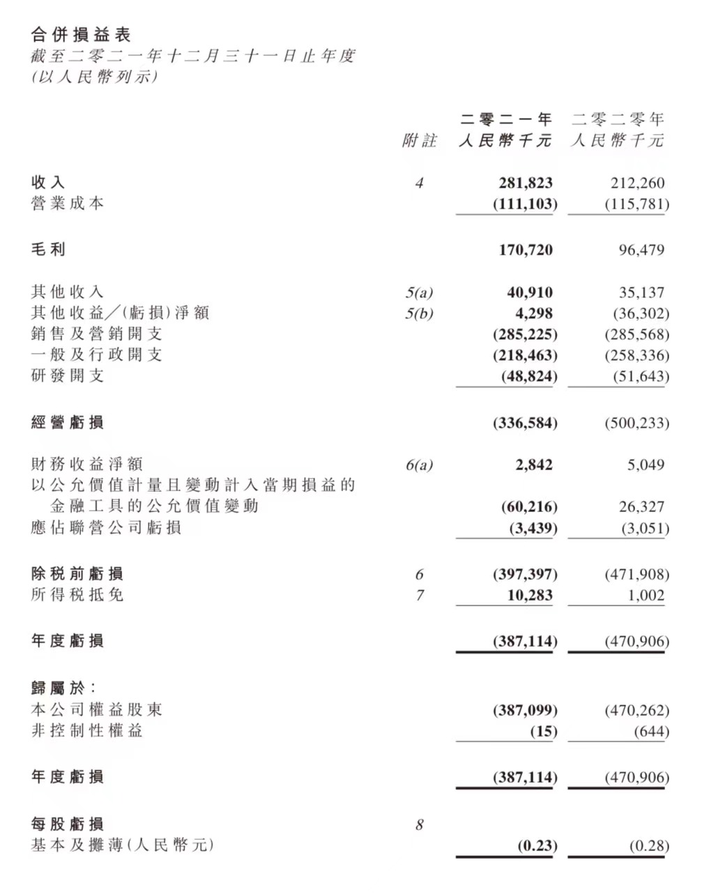 2021年,毛利为1.7亿元,去年同期为9647.9万元,同比增长77%;经营亏损由去年同期的5亿元缩窄至3.37亿元。