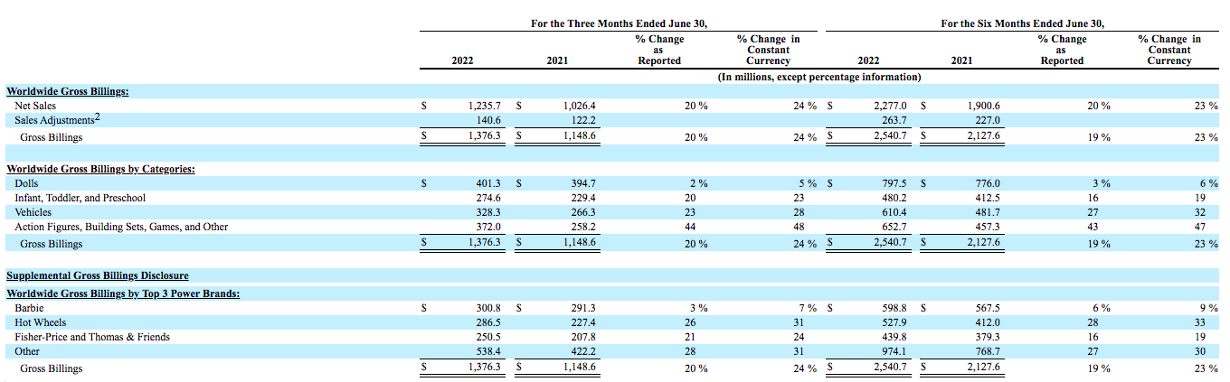 多知网7月28日消息,美国玩具制造商美泰(Mattel)(NASDAQ: MAT)公布了2022财年Q2财务业绩报告。2022财年Q2,美泰净销售额为12.357亿美元,按固定汇率算,同比增长24%,按实际汇率算,同比增长20%;净利润为6640万美元,上年同期净亏损550万美元,扭亏为盈。2022财年上半年,美泰净销售额为22.77亿美元,同比增长20%;净利润8790万美元,上年同期净亏损1.179亿美元,扭亏为盈。