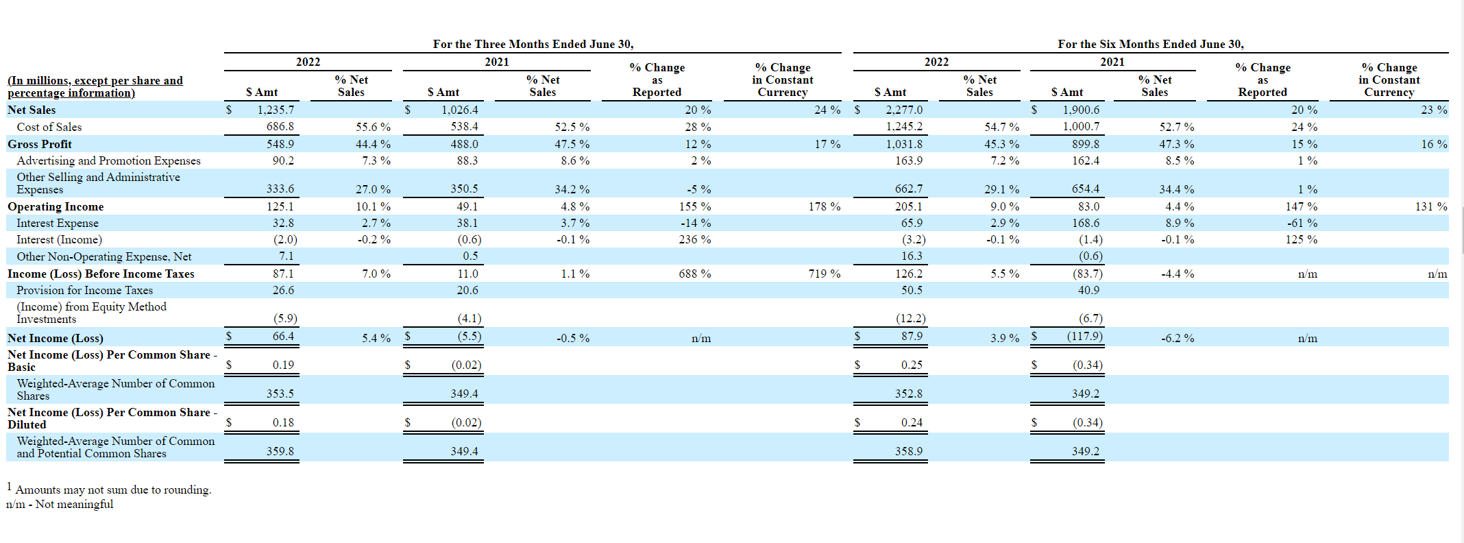 与去年第二季度相比,北美地区的净销售额(按固定汇率算)较2021年同期增长了30%,而国际总净销售额同比增长12%。而亚太地区受疫情及供应链影响,尽管日本和澳大利亚业务有所增长,但整体业绩略有下降。