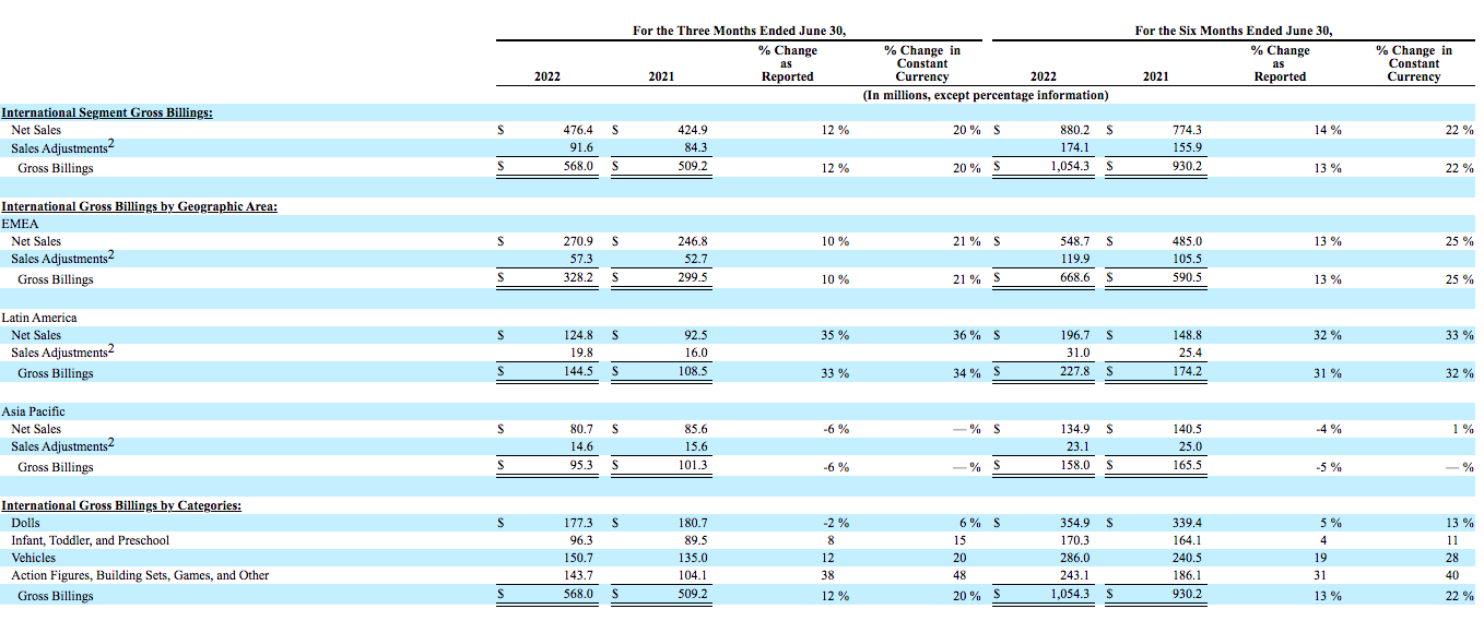 按照品类来划分,娃娃贡献现金收入4.013亿美元,同比增长2%;可动玩偶/积木/游戏/其他(包括Jurassic World™侏罗纪世界、Lightyear光年正传)类别贡献3.72 亿美元,同比增长44%;玩具车贡献3.283亿美元,同比增长23%;婴幼/学龄前贡献2.746亿美元,同比增长20%。