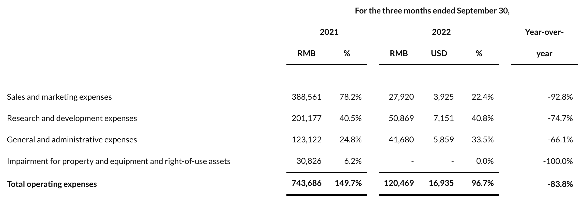 2022年第三季度的总运营费用为人民币1.205亿元(合1690万美元),其中包括人民币3180万元(合450万美元)的股票薪酬费用,较2021年第三季度的人民币7.437亿元同比减少83.8%。