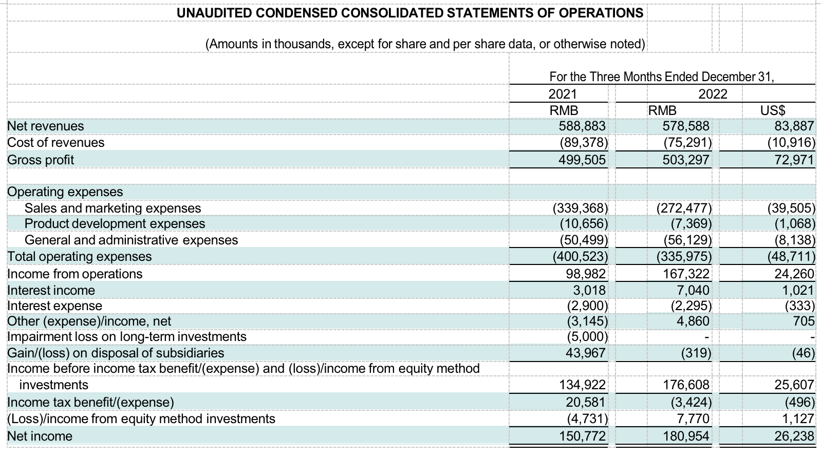 截至2022年12月31日,公司拥有7.574亿元(1.098亿美元)的现金、现金等价物和限制性现金,以及人民币7050万元(1020万美元)的短期投资;截至2021年12月31日,公司拥有6.767亿元的现金、现金等价物和限制性现金,以及1.842亿元的短期投资。