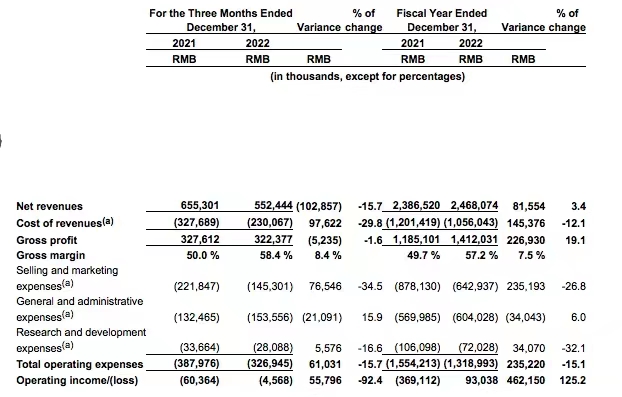 多知网3月28日消息,达内教育(NASDAQ: TEDU)今日公布2022财年第四季度和2022财年全年未经审计业绩报告。2022财年第四季度,达内教育营收5.52亿元,同比下降15.7%;净亏损1770万元,上年同期净亏损1.825亿元。2022财年,营收24.681亿元,同比增长3.4%;净利润8523万元,上年同期净亏损4.758亿元,同比实现扭亏为盈。