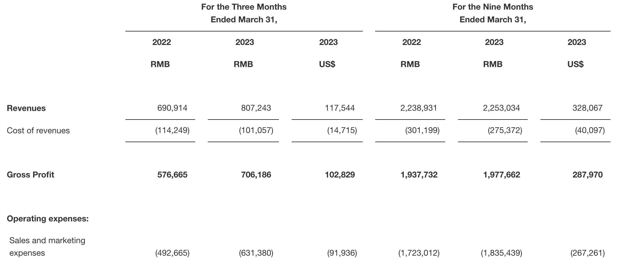 收入成本从2022财年第三季度的1.142亿元下降至2023财年第三季度的1.011亿元(1470万美元),同比下降11.5%,主要原因是公司优化运营和实现更好的成本管理,劳动力外包成本减少了980万元(140万美元),员工成本减少了880万元(130万美元)。