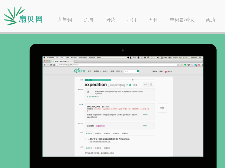 扇贝网正式创立于2011年,除了网站外,还按照功能垂直划分,开发了4款APP产品:扇贝读书、扇贝新闻、扇贝词汇、扇贝炼句。