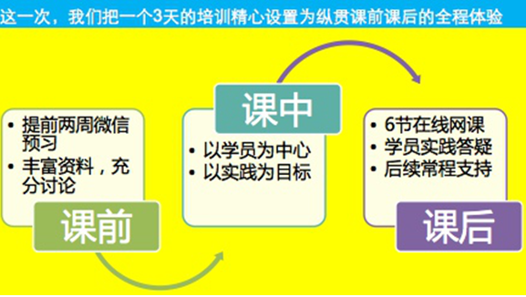 社会化的本质是“人人都是自媒体”,利用社会化社交渠道来完成相应的任务。这次课程的升级,也增加了社会化的元素,3天的课程中从课前到课中,到课后都会充分利用微信,网络考试系统等聚到,通过用户习惯的方式来完成,课前课后作业,课上讨论分享,以及学员之间的互动交流。