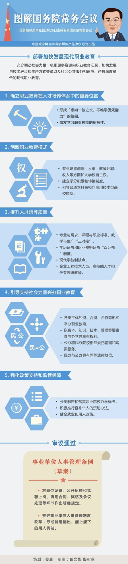 国务院总理李克强2月26日主持召开国务院常务会议,部署加快发展现代职业教育,审议通过《事业单位人事管理条例(草案)》。