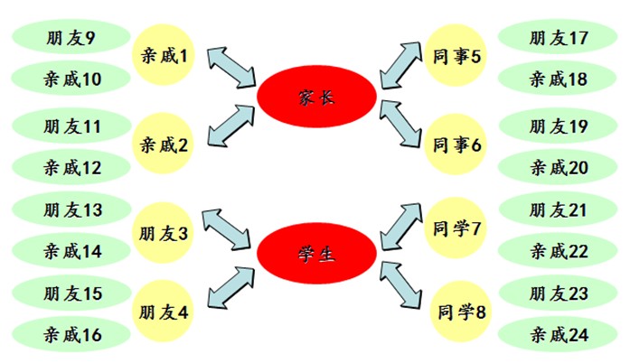 基于这样的一些长期统计基础,我们不妨建立一个简单的模型(姑且叫它“家庭影响力模型”):一个三口之家,两位家长各有一个经常来往的亲戚和一个关系较好的同事,而每个亲戚或同事也有这样两个关系近的亲朋。而一个学生同样有这样的朋友同学关系。那么,一个家庭可以有效辐射24个家庭。
