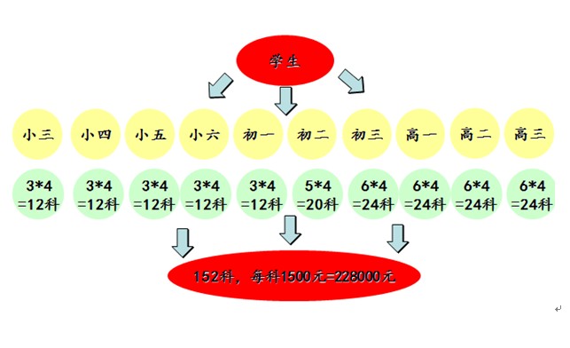 假设这个学生一直坚持不懈地从三年级补习到高三,无论他是在新东方补习英语,或者在学而思实习奥数,还是在卓越教育补习奇趣作文,那么他在这十年中将报读152科次的课程。而进一步假设他参加的是学费在1500元的普通班级制辅导班而不参加所谓个性化但收费高昂的一对一辅导,那么在这十年中,所消费的学费将达到22.8万元,差不多是2014款沃尔沃V40或宝马X1的价格。