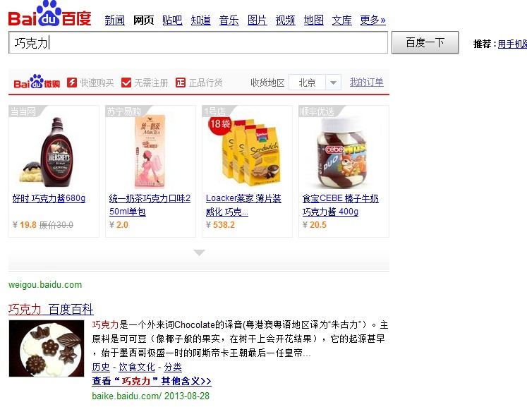 现在,去百度搜“好玩的网游”,百度爱玩提供的游戏占据自然结果的第一位(如下图);搜“巧克力”,微购的推荐结果也是第一位。