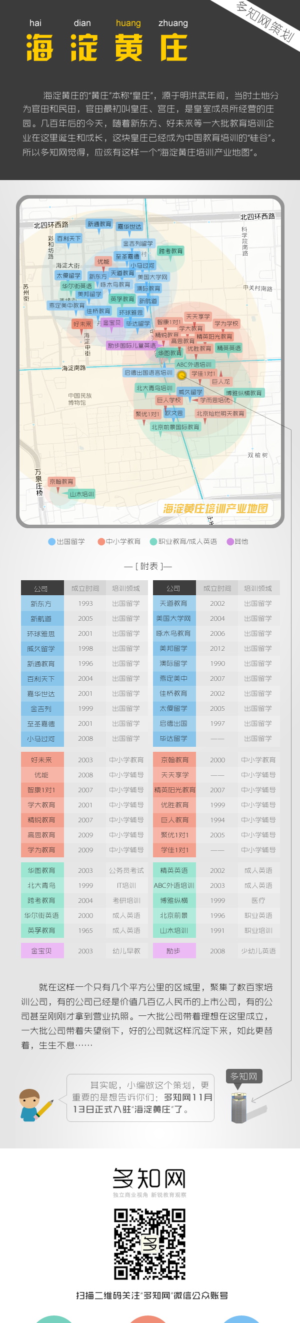海淀黄庄的“黄庄”本称“皇庄”,源于明洪武年间。当时土地分为官田和民田,官田最初叫黄庄、宫庄,是皇室成员的庄园。几百年后的今天,随着新东方、好未来等一大批教育培训企业在这里诞生和成长,这块皇庄已经成为中国教育培训界的“硅谷”。所以,多知网觉得,应该有这样一个“海淀黄庄培训产业地图”。