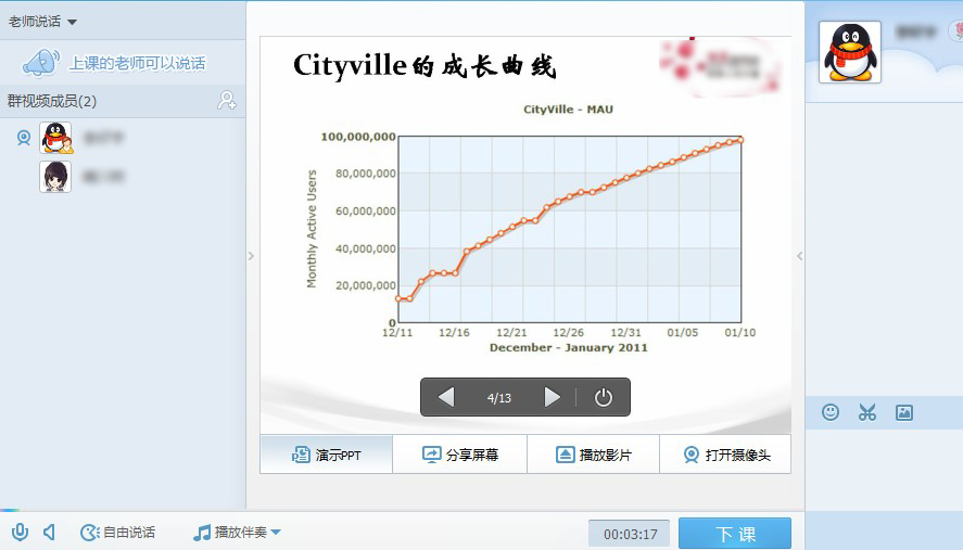 5:开始讲课,目前提供的几项功能都比较实用,第一个是PPT演示(如图3),老师可以根据需要,手动选择PPT翻页,配合语音授课,学生如有疑问,可在右边栏输入文字。多知网实测,课程演示过程中,PPT约有1~2秒延时(家庭局域网),语音基本同步。