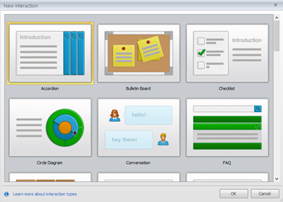 利用engage新建交互的首页,提供了20种交互表格形式,用户可以直接利用这些模板创建交互课程。