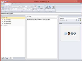 目前世界上使用最广泛的e-learning课件制作工具之一,包括下列四个核心功能模块:Articulate Engage(快速制作课件交互的模板工具)、Articulate Quizmaker(快速制作交互试题)、Articulate Video Encoder(视频转换切割工具)、Articulate Presenter(将PowerPoint快速转换为Flash演示或E-learning课件)