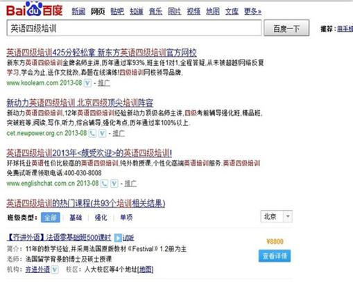 测试期最大的问题在于,由于前期参与竞价的机构少,为了展现知心的框式结构,知心系统会进行宽泛匹配,如搜索“英语四级培训”的词会匹配出“法语培训”的课程来。