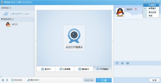 2013年11月,腾讯QQSP5版本中,增加了PPT等教育相关的基础功能,专为远程教育量身定做。打开群视频的教育模式,可选择“演示PPT”、“分享屏幕”、“播放影片”、“打开摄像头”四项功能。