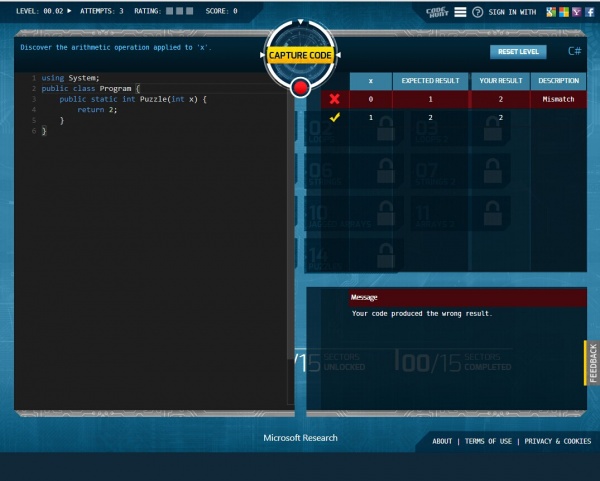 作为一个代码猎人,玩家必须尽可能多地发现、存储和捕获代码片段。Code Hunt建立在微软的Pex动态符号执行程序上,能够分析出输入某个代码产生的结果,为用户提供自定义的游戏进度反馈。