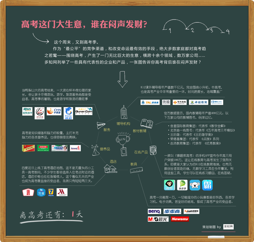 又到高考季,作为“最公平”的竞争渠道,和改变命运最有效的手段,多数家庭都对高考趋之若鹜——围绕高考,也产生了一门无比巨大的生意,横跨数十个领域,数万家公司……多知网选择了一些有代表性的企业和产品,告诉你高考背后,谁在闷声发财?