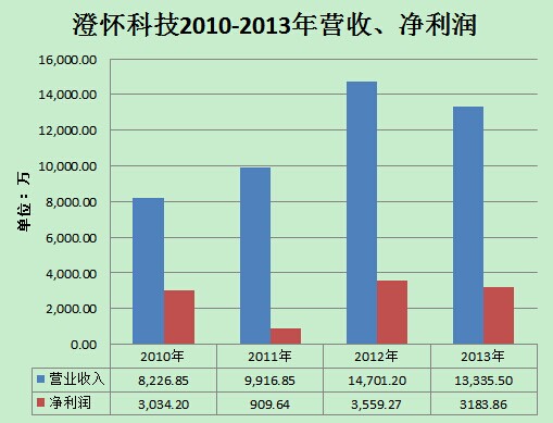(图:澄怀科技2010年-2013年营收、净利润走势图)