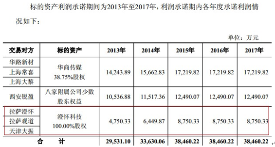 根据华闻传媒与拉萨澄怀、拉萨观道、天津大振签订的《盈利预测补偿协议》,拉萨澄怀、拉萨观道、天津大振对澄怀科技资产利润做出承诺:2013 年度、2014年度、2015 年度、2016 年度和2017 年度实现的扣除非经常性损益后归属于母公司所有者的净利润分别不低于4750.33 万元、6449.87 万元、8750.33 万元、8750.33 万元和8750.33 万元。