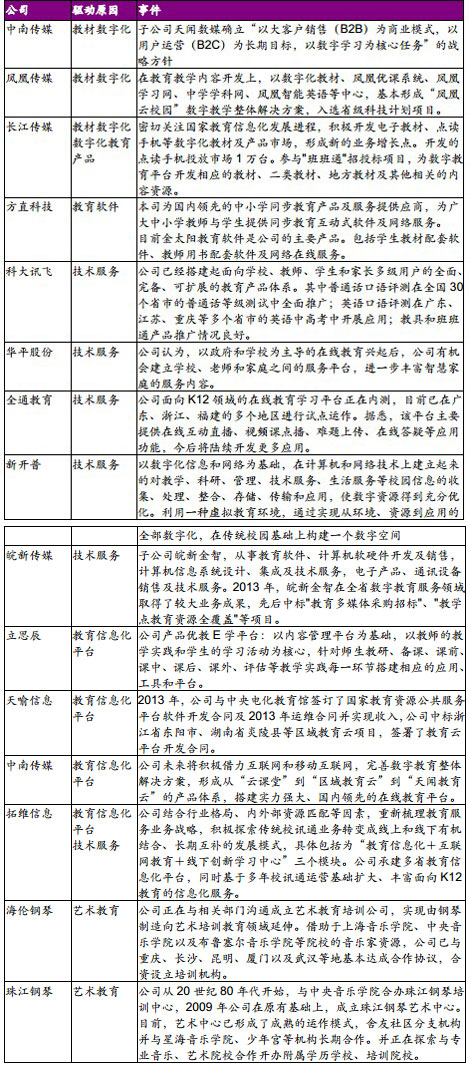 1、涉及数字化教育产品:包括中南传媒、凤凰传媒、长江传媒以 及方直科技。