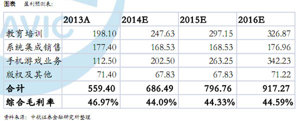 公司通过培训学校的模式,已经实现了华南地区5个校区,华中地区23个校区的规模水平,覆盖学生群体10万余人,课程涵盖了面对K12群体的高中、初中、小学及特色课程(英语、写作、数学)等。2013年培训收入超过3000万,是公司业务体系中增长较快且毛利率较高的业务之一。在线下资源的布局中,公司依托资金优势采取的是参股或并购的模式,对业务的快速扩张起到了重要作用。