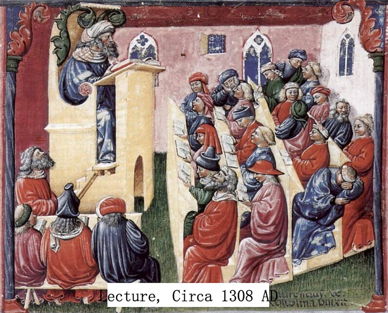 下面这张图是Lecture,意大利的一所大学,公元前1088年建立的,它并没有很多的变化,这个讲座是700年前讲座的场景,大家看有什么变化吗?我站在讲台上,你们在台下,这种讲课的模式700年来都没有巨大的变化。